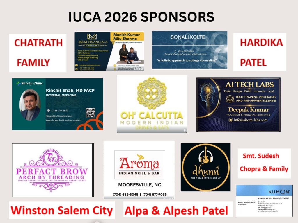 IUCA appreciates our sponsors* as they are the backbone for high-scale events like this, please visit and promote the local businesses. They are helping us to make these events real, by coming out and sponsoring voluntarily to promote Indian culture in TRIAD.